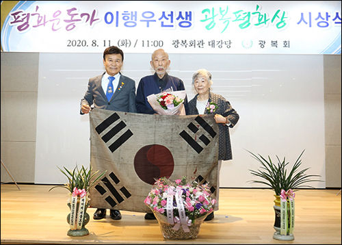 [우리문화신문=이윤옥 기자] 김원웅 광복회장은 11일 한평생 꿋꿋이 민족의 화해와 상생을 위해 헌신해 왔으며, 거룩한 생명신앙으로 한반도 분단극복과 평화정착에 이바지해 온 이행우 평화운동가에게 제1회 ‘광복평화상’을 주었다.