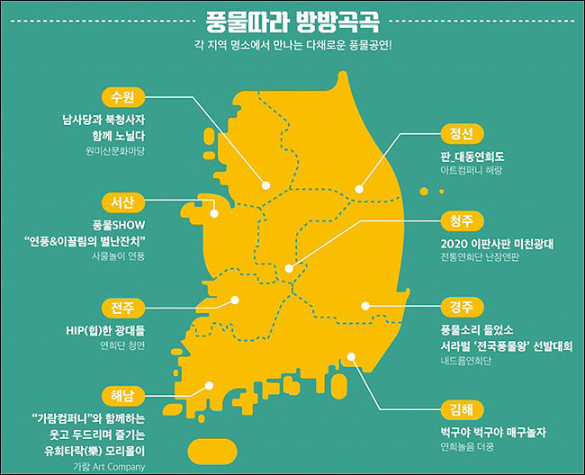 2013년부터 시작된 전국풍물상설공연‘어울마당 풍물세상’은 전통공연예술진흥재단이 주관하는 문화공연으로서 전통풍물에 대한 대중들의 관심을 높이고 지역풍물단체의 네트워크를 활성화하고자 추진하는 사업이다.