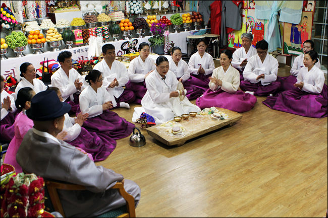 28) 잔내림 - 맑은 술로 채운 열두 개 잔을 상 위에 올려 신령이 강림토록 빌며 국태민안, 시화연풍, 태평성대를 축원하고 만 단골, 만 기자, 만 자손, 만 백성의 만 가지 구설수와 만 가지 액을 막고 만수무강을 기원한다.