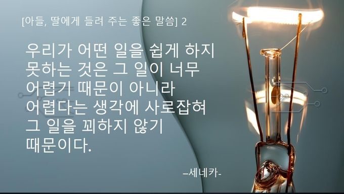 오늘 들려 주고 싶은 좋은 말씀은 "우리가 어떤 일을 쉽게 하지 못하는 것은 그 일이 너무 어렵기 때문이 아니라, 어렵다는 생각에 사로잡혀 그 일을 꾀하지 않기 때문이다."란다. 이 말은 로마의 슬기맑힘이(철학자) '세네카'라는 분이 한 말이라고 하는데 무슨 일이든 쉽고 어렵고를 생각하기 앞서 꾀해 보는 것이 얼마나 종요로운 것인지를 힘주어 나타내고 있는 말이라고 생각해.