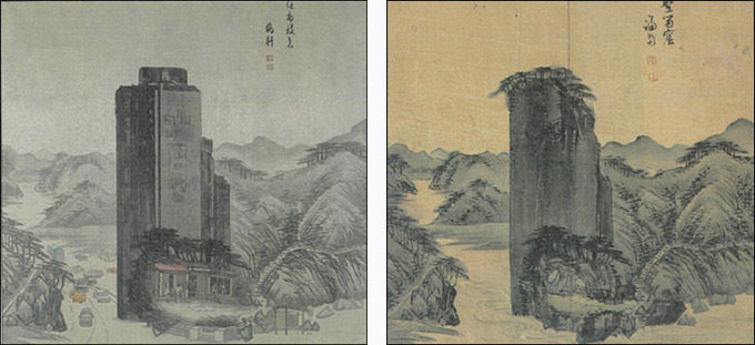 이 그림은 전통적인 산수화에 현대적인 소재를 함께 그려 넣은 작품입니다. 전통적인 산수화에서 볼 수 있는 산의 모습을 배경으로 앞에는 현대적인 건물과 자동차 등이 그려져 있습니다. (p.122)