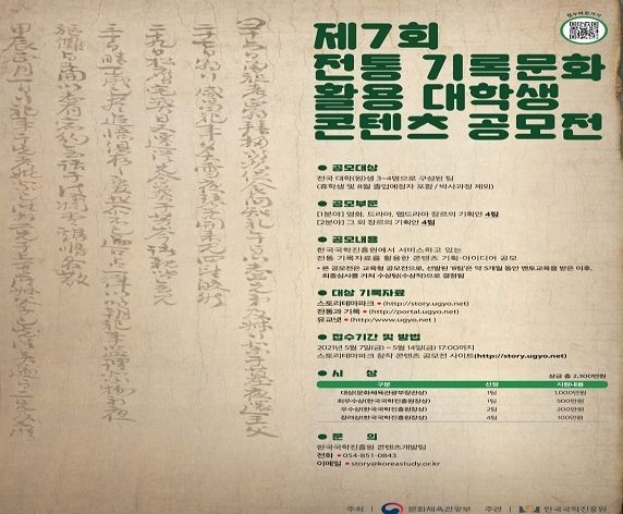 문화체육관광부(장관 황희, 이하 문체부)는 과거와 현재를 이어주는 전통 기록문화의 무한한 가능성에 착안해 한국국학진흥원(원장 정종섭, 이하 국학진흥원)과 함께 5월 7일(금)부터 14일(금)까지 ‘제7회 전통 기록문화 활용 대학생 콘텐츠 공모전(부제: 스토리테마파크 창작 콘텐츠 공모전)’을 개최한다.