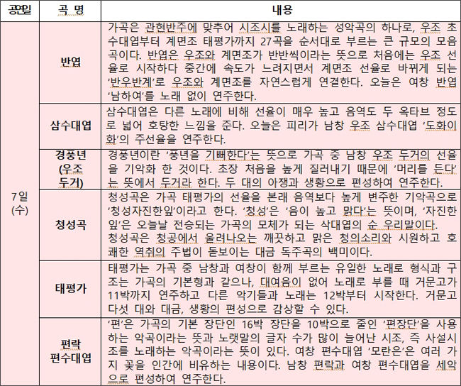 공연의 첫날인 7월 7일(수)에는 ‘기악으로 듣는 정가’라는 이름으로 기존 가곡에 노래를 빼고 악기편성 등을 달리하여 반주가 아닌 ‘감상 음악’으로서의 가곡을 전한다. 그동안 노래에 가려져 순수하게 접하기 어려웠던 기악 연주곡을 통해 감상 음악으로서의 예술성을 오롯이 접할 수 있도록 구성했다.