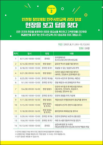 한편 민주시민 리더 양성과정 ‘지역을 보고 답을 찾다’ 프로그램은 인천의 의미 있고 중요한 지역을 탐방하여 지역이 안고 있는 문제를 논의하고 해결방안을 찾아가는 과정으로 8월 11일부터 10월 13일까지 모두 14회에 걸쳐 현장 탐방과 온라인(Zoom) 토의를 병행하며 진행된다.