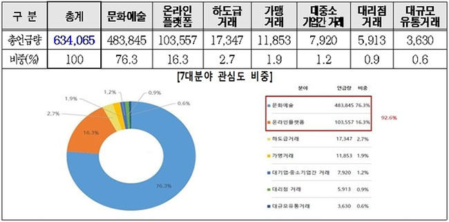 `19년에 비해 `20년 데이터량이 가장 급증한 분야는 ‘온라인플랫폼’(65%)이었고 ‘문화예술’은 27% 증가하였다. 전체 데이터를 ‘갑을관계’ 피해가 많은 7개 분야로 나눠 분석한 결과 △ 문화예술분야가 76.3%로 가장 높은 비중을 차지했고, △ 온라인플랫폼(16.3%) △ 하도급거래(2.7%) △ 가맹거래(1.9%) △ 대중소기업간거래(1.2%) △ 대리점거래(0.9%) △ 대규모 유통거래(0.6%) 순으로 나타났다.