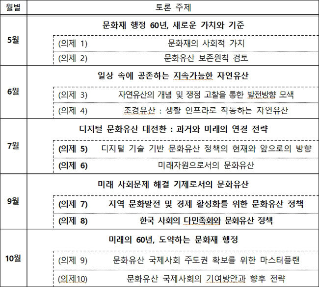 문화재청은 오는 10월 마지막 회차인 5번째 토론회를 마무리한 후 그동안의 토론회에서 도출된 내용과 각계 전문가의 의견을 반영하여 문화재 행정 미래의 중장기 전략인 ’문화재 행정 60년 미래전략(가칭)’을 수립하여 10월 중으로 발표할 계획이다.
