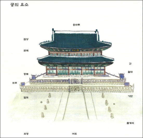월대: 정전과 같이 중요 건물 앞에 놓이는 넓은 무대로 하례나 제례 등의 각종 행사에 이용된다.