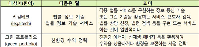 문체부와 국어원은 ‘리걸테크’처럼 어려운 말 때문에 국민이 정보에서 소외되지 않도록 ‘법률 정보 기술, 법률 정보 기술 서비스’와 같이 쉬운 말로 발 빠르게 다듬고 있다. 꼽힌된 말 말고도 일반 국민이 이해하기 쉬운 다른 우리말 바꿈말이 있다면 쓸 수 있다. 앞으로도 문체부와 국어원은 정부 부처와 언론사가 주도적으로 쉬운 말을 사용할 수 있도록 계속 홍보할 계획이다.