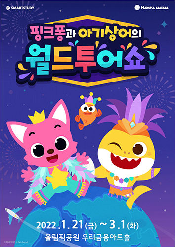 [우리문화신문=이나미 기자] 오는 1월 21일부터 3월 1일까지 서울 올림픽공원 우리금융아트홀(역도경기장)애서는 <핑크퐁과 아기상어의 월드투어쇼> 뮤자컬 공연이 열린다. 이 뮤지컬은 핑크퐁과 아기상어, 그리고 튼튼샘까지 전 세계가 자랑하는 어린이 콘텐츠의 주인공들이 총출동한다,