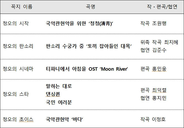 공연을 여는 ‘정오의 시작’에는 이번 공연의 지휘자 조원행이 작곡한 국악관현악을 위한 ‘청청(淸靑)’을 연주한다. 2011년 대한민국작곡상 우수상을 받은 곡으로 자연이 주는 소중한 소리를 관현악에 담았다. 빠름과 느림을 대비적으로 표현하고 악기군마다 선율적 주제를 제시하여 생동감 있는 곡의 전개를 유도한 곡이다.
