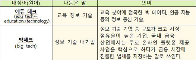 문체부는 ‘쉬운 우리말 쓰기 사업’의 하나로 국어원과 함께 외국어 새말 바꿈말 제공 체계를 구축해 운영하고 있다. 문체부와 국어원은 지난 6월 15일(수)에 열린 새말모임*을 통해 제안된 의견을 바탕으로 의미의 적절성과 활용성 등을 다각으로 검토해 ‘에듀 테크’의 대체어로 ‘교육 정보 기술’을 꼽았다.