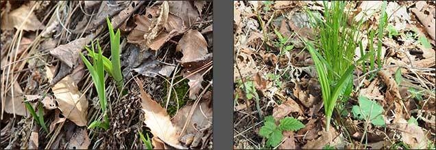 <마늘 대 박새> 독초인 ‘박새’는 주로 명이나물로 불리는 ‘산마늘’과 구분하기 어려운데 ‘박새’는 여러 장의 잎이 촘촘히 어긋나 있으며 주름이 뚜렷하다. 반면 ‘산마늘’은 마늘(부추) 향이 짙게 나고 줄기 하나에 2~3장의 잎이 달려 있어 구별할 수 있다.