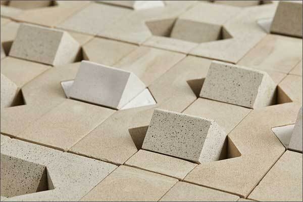 주윤정 작가는 《보이지 않는 구조물》전을 통해 보도블록의 형태를 변형해 만든 모듈 시스템을 여러 방식으로 구성한 작품을 선보인다. 우리가 날마다 밟고 다니는 보도블록은 땅에 매립되어 있어 평면처럼 보이지만 실제로는 입체의 형태다. 주 작가는 땅에 묻혀 볼 수 없는 지면 너머의 형태에 흥미를 갖고 상상력을 더해 시각적 아름다움을 줄 수 있는 객체를 만들었다. 이를 실내 공간에 적용해볼 수 있는 한 요소로 제안한다.