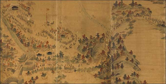 수원화성 전체를 조망하는 구도로 그린 12폭 병풍 ‘화성전도’(사진1)는 19세기 전반의 그림이다. 수원유수부의 중요 건물인 화성행궁과 화령전을 둘러싼 성곽을 자세히 묘사했다. 화면 오른쪽 윗부분에 지지대 고개를 넘은 수원유수의 부임 행렬이 만석거를 지나며 장안문을 거쳐 화성행궁으로 향하고 있다. 성곽 바깥에는 훈련 중인 군사들이 진을 치고 있다.