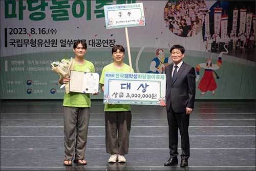 [우리문화신문=이한영 기자] 국립무형유산원(원장 안형순)이 주최하고 한국문화재재단(이사장 최영창)이 주관하는 「제26회 전국대학생마당놀이축제」가 지난 16일 국립무형유산원 얼쑤마루 대공연장(전북 전주 소재)에서 성공적으로 열렸다.