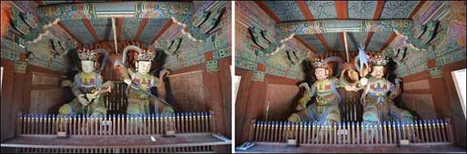 [우리문화신문=한성훈 기자] 문화재청(청장 최응천)은 절 입구 천왕문에서 부처님의 가르침과 불국토를 수호하는 17세기 「사천왕상(四天王像)」 8건을 보물로 지정 예고하였다. 아울러 「영광 불갑사 목조사천왕상(靈光 佛甲寺 木造四天王像)」이 보물 지정 예고됨에 따라 보물 「영광 불갑사 불복장 전적(靈光 佛甲寺 佛腹藏 典籍)」 가운데 사천왕상 복장전적은 사천왕상과 함께 일괄로 보존ㆍ관리하기 위해 해제 예고하였다.