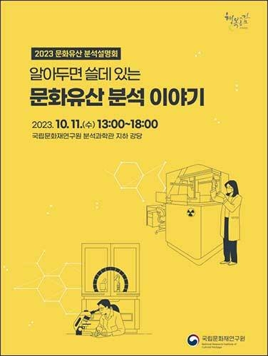 [우리문화신문=한성훈 기자] 문화재청 국립문화재연구원(원장 김연수)은 10월 11일 국립문화재연구원(대전시 유성구) 분석과학관 강당에서 보존과학을 전공하는 대학생과 대학원생을 대상으로 최신 분석기술과 현장 적용 사례를 소개하는 문화유산 분석 설명회 「알아두면 쓸 데 있는 문화유산 분석 이야기」를 연다. 국립문화재연구원은 2017년부터 해마다 보존과학과 고고학 등 문화유산 분야의 대학생과 대학원생들을 대상으로 문화유산 분석 설명회를 열어 관련 정보를 제공해 왔으며, 2019년부터 지난해까지는 코로나19로 인해 비대면으로 전환하였다가 올해부터 다시 대면 행사로 열게 됐다.