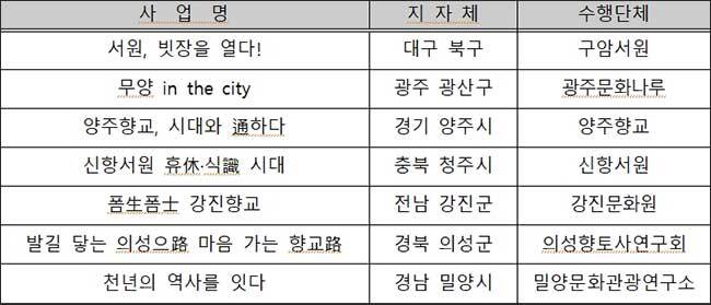 ‘향교ㆍ서원 문화유산 활용’ 부문에서는 ▲ 문화유산 활용사업에 대한 이해를 토대로 안정적인 조직체계를 갖추어 지속해서 프로그램을 운영한 「서원, 빗장을 열다!(대구 북구)」, ▲ 주변 경관과 공간적 여건을 이용하여 차별화된 콘텐츠를 개발한 「양주향교, 시대와 통(通)하다(경기 양주시)」, ▲ 지역주민, 소외계층, 외국인 등을 대상으로 맞춤형 프로그램을 운영한「발길 닿는 의성으로(路) 마음 가는 향교로(路)(경북 의성군)」등 7개 사업이 뽑혔다.