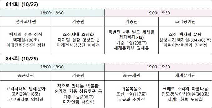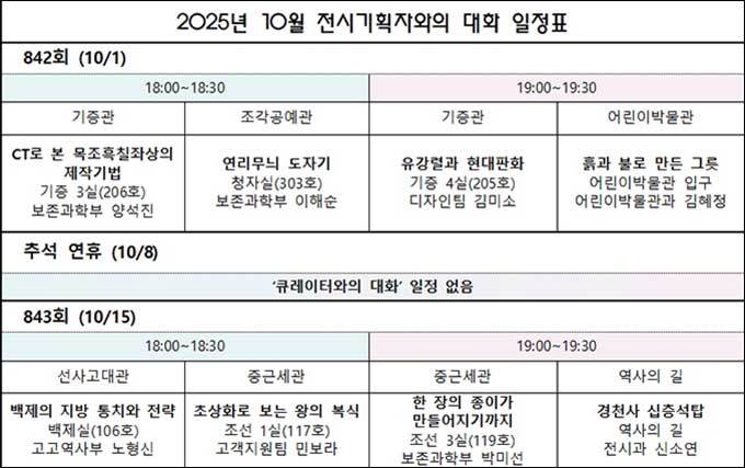 [우리문화신문=한성훈 기자]  국립중앙박물관(관장 유홍준)은 매주 수요일 야간개장 시간(18:00~21:00)에 ‘전시기획자와의 대화’를 연다. 10월 '문화의 달'을 맞아 선사고대관, 중·근세관, 기증관에서 다양한 전시품의 이야기를 폭넓게 다루는 해설을 마련해, 가을 저녁 역사와 문화를 깊이 음미하는 기회를 제공하고자 한다. 이번 10월 프로그램은 10월 8일 한가위 연휴를 제외한 모두 16회로 진행된다. 선사고대관 백제실에서는 관모와 꾸미개 등을 통해 ‘백제의 지방 통치와 전략’을 살펴볼 수 있으며, ‘백제의 건축장식’에서는 치미, 기와 등에 나타난 백제의 장식성과 아름다움을 소개한다.