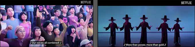 ‘캐데헌’이란 애니메이션에는 캐나다에 사는 한국 교민인 메기 강 감독이 의도한 대로 등장하는 인물, 장소, 문화가 온통 한국적이다. 김밥과 컵라면, 수저를 받치는 냅킨이 나온다. 언어는 제작사의 모국어인 영어인데 그걸 둘러싼 정서와 배경은 영락없는 한국의 것들이다. 케이팝의 위력이 전 세계를 강타하고 있으니 이런 것들이 미국의 투자를 받아 애니메이션 영화로 옮겨낼 수 있었을 것이다. 그 속에서 한국어와 한글이 나오니 그 효과는 다른 어떤 선전수단보다도 강력하다, 무엇보다 매기 강 스스로가 에이치오티(HOT), 서태지와 아이들, 원타임 같은 1세대 케이팝 그룹들을 좋아한 엑스세대였고 곡을 만들고 부른 이재는 자신이 바로 그 노래의 주인공이었기에 이런 것이 그대로 살아날 수 있었다고 보인다.