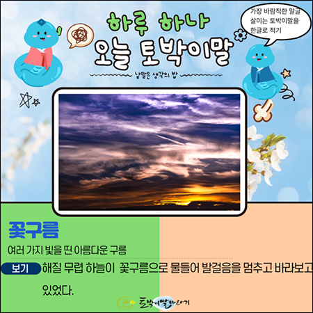 그리고 이 아름다운 말을 혼자만 알고 있기에는 너무 아깝지 않은가요? 곁에 있는 이에게 “하늘에 꽃구름이 참 예쁘다.”, “저기 많은 꽃들이 꼭 꽃구름 같아.” 하고 말을 건네보세요. 우리가 함께 쓸 때, 우리의 말과 삶은 꽃구름처럼 더욱 아름답게 피어날 것입니다.