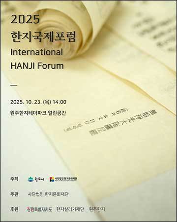 [우리문화신문=김영조 기자]  (사)한지문화재단(이사장 김진희)이 오는 10월 23일(목) 낮 2시, 원주한지테마파크 열린공간에서 ‘2025 한지국제포럼(International HANJI Forum)’을 연다. 원주시와 (사)한지문화재단이 주최하고 강원특별자치도, 한지살리기재단, 원주한지가 후원하는 이번 포럼은 ‘문명시대를 연 수제종이 한지, 유네스코 인류무형문화유산 등재로 제2의 르네상스시대를 열자!’라는 구호 아래 진행된다.