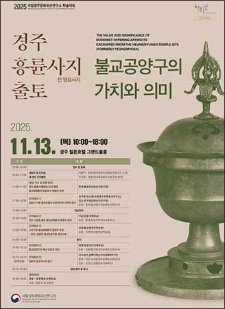 [우리문화신문=한성훈 기자] 국가유산청 국립문화유산연구원 국립경주문화유산연구소(소장 임승경, 이하 ‘경주연구소’)는 오는 11월 13일(목) 아침 10시 경주 힐튼호텔 그랜드볼룸에서 「경주 흥륜사터(전 영묘사터) 출토 불교공양구의 값어치와 의미」 학술대회를 연다. 이번 학술대회는 2023년 경주시 사정동에서 발굴된 고려시대 불교공양구의 조사ㆍ연구 성과를 종합적으로 검토하고, 당시 불교 의례 문화의 성격과 의의를 새롭게 조명하기 위해 마련되었다. 불교미술ㆍ고고학ㆍ보존과학 등 관련 분야 전문가들이 한자리에 모여 불교공양구의 보존처리와 과학적 분석 결과를 공유하고, 각 분야의 연구 성과를 여러 모로 논의할 예정이다.