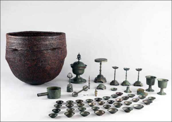 참고로, 경주 흥륜사터(전 영묘사터) 출토 불교공양구는 2023년 경주시 사정동 292-1번지 하수관로 설치를 위한 발굴조사 중 철솥 안에서 확인된 고려시대 유물 58점이다. 국내 처음 발굴된 사례로, 화려한 조형미와 정교한 제작기법이 주목되는 ‘연화형 촛대받침’과, 고려시대 경주지역에서 수행된 밀교의식의 존재를 짐작게 하는 ‘금강저ㆍ금강령’을 비롯해 청동향로, 청동향완, 청동광명대, 청동촛대 등이 함께 발굴되어, 고려 불교의 예술적 수준과 의례문화의 다양성을 보여주는 중요한 자료로 평가된다.