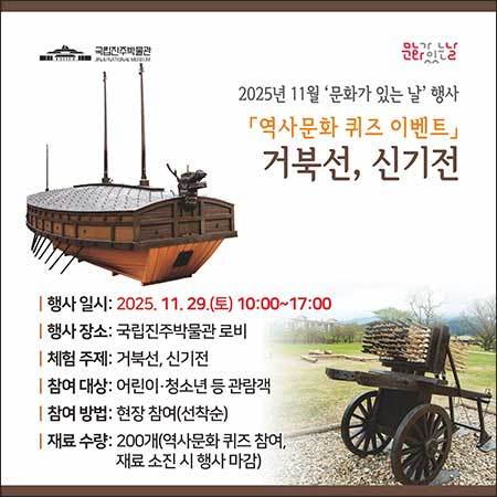 [우리문화신문=이한영 기자] 국립진주박물관(관장 장용준)은 11월 <문화가 있는 날>을 맞아 오는 29일 토요일 아침 10시부터 박물관 로비에서 역사문화 체험과 퀴즈 반치를 운영한다. 이번 행사는 조선 수군의 돌격선으로 임진왜란 때 해전에서 승리하는 데 중요한 역할을 한 ‘거북선’과, 앞부분에 폭발장치를 붙인 로켓 추진화살로 조선의 최첨단 과학 기술을 보여주는 무기인 ‘신기전’이 주제다.