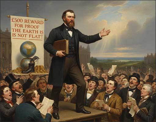 그라임스는 <페이크와 팩트>에서 19세기 지구평면설 광신자 존 햄프던에 관해 얘기합니다. 성경을 글자 그대로 해석하는 종교 광신자인 햄프던은 1870년 1월 <사이언티픽 오피니언>에 지구가 평평하다는 자기 생각이 틀렸음을 증명하는 사람에게는 500파운드를 주겠다고 광고합니다. 여기에 순진한 윌리스가 걸려듭니다. 당시 주머니 사정이 좋지 않았던 윌리스는 지구가 둥글다는 것을 입증할 자신이 있었던 것이지요.
