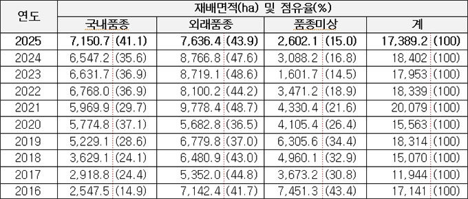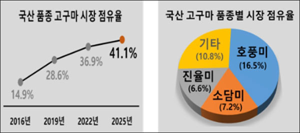[우리문화신문=성제훈 기자] 국산 고구마가 외래품종을 빠르게 대체하며 국내 고구마 산업의 중심으로 자리 잡고 있다. 농촌진흥청(청장 이승돈)은 우수 품종 보급 확대로 국산 고구마 품종 점유율이 2016년 14.9%에서 2025년 41.1%로 올랐다고 밝혔다. 같은 기간 재배면적도 2,548헥타르(ha)에서 7,151헥타르(ha)로 약 2.8배 확대했다. 국산 품종 중에서는 ‘호풍미’, ‘소담미’, ‘진율미’가 주력 품종으로 국산 고구마의 73.5%를 차지하며 점유율 확대를 견인하고 있다.