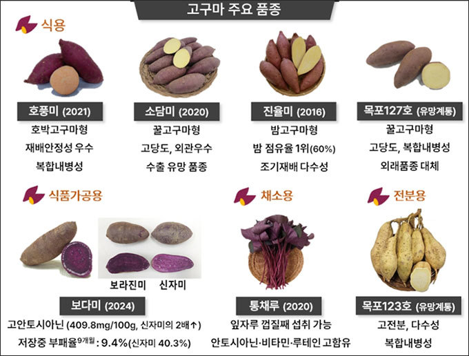 농촌진흥청은 앞으로 기후변화 대응형 고품질 품종 육성과 가공수출 산업화를 병행해 2030년까지 국산 고구마 점유율을 50%까지 끌어올릴 계획이다. 이를 위해 ▲재배 안정성이 우수한 용도별 맞춤 품종 개발 ▲고구마 생산 거점 단지 조성 ▲정식기ㆍ복합 수확기 개발 등 기계화 생산 기반 확충을 중점 추진하고 있다.