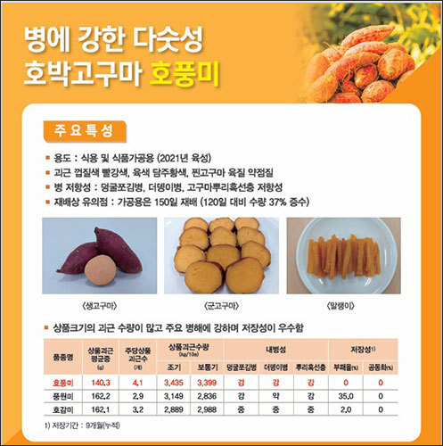 특히 호박고구마형 ‘호풍미’는 병해에 강하고 이상기상에서도 안정적인 수량을 확보해 재배 안정성이 우수하다. 이에 힘입어 보급 4년 만에 전체 재배면적의 16.5%(2,860.7ha)*를 차지하며 재배면적 1위에 올랐다. 그 뒤를 꿀고구마형 ‘소담미’(7.2%, 1,244.2ha), 밤고구마형 ‘진율미’(6.6%, 1,149.7ha), 호박고구마형 ‘호감미’(5.5%, 956.9ha) 등이 이으며 생산성 향상에 기여하고 있다.