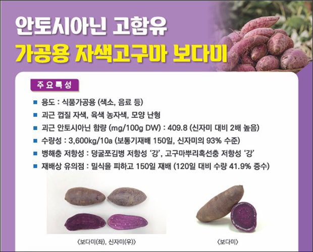 이 가운데 색깔고구마 ‘신자미’는 천연색소용 자색고구마로 음료, 제과·제빵, 떡류 등 가공식품 원료로 활용되고 있다. 신품종 ‘보다미’는 안토시아닌 함량이 ‘신자미’보다 2배 높고 부패율이 낮으며 병해충에도 강하다. 올해부터 농가에 보급돼 자색고구마 가공 산업에 활기를 불어넣을 것으로 보인다. 채소용 ‘통채루’는 잎자루가 자색으로 안토시아닌이 풍부해 기능성 채소*로 주목받고 있다. 후속으로 녹색 채소용 품종도 육성하고 있다.