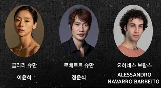 출연진은 클라라 슈만 역에 이윤희, 로베르트 슈만 역에 정운식, 요하네스 브람스 역에 ALESSANDRO NAVARRO BARBEITO, 홍성우, 강석원, 신선미, 이미리, 박경희, 김향림, 정다은, 김서윤, 고동훈, 천재우이 무대에 오르며, 이밖에 피아니스트 김고운, 바이올리니스트 변예진, 첼리스트 변새봄, 비올리스트 조재현 이 출연한다. 제작진은 예술감독 김인희, 작가 기나리, 안무 제임스전, 기획 노민혁, 조안무 전선영, 의상디자인 솔패션, 무대디자인 이태섭, 무대감독 송주관, 음악감독 박정원, 조명감독 박정현, 제작감독 여훈, 홍보디자인 송우람이 함께한다.