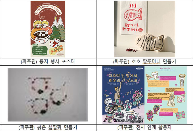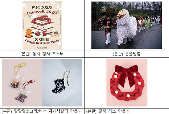 [우리문화신문=김영조 기자] 국립민속박물관(관장 장상훈)은 오는 12월 22일(월) 동지를 맞아 한 해의 액운을 몰아내고 2026년 새해의 행운을 기원하는 세시풍속 행사 <안녕 2025년! 동지팥티>를 연다. 이번 행사는 서양의 크리스마스 문화에 익숙한 현대인들에게 우리의 겨울 명절인 동지에 대한 인식을 높이기 위해 기획했다. 국립민속박물관 본관에서는 동짓날인 12월 22일(월), 파주관에서는 12월 20일(토)에 다양한 행사를 즐길 수 있다.