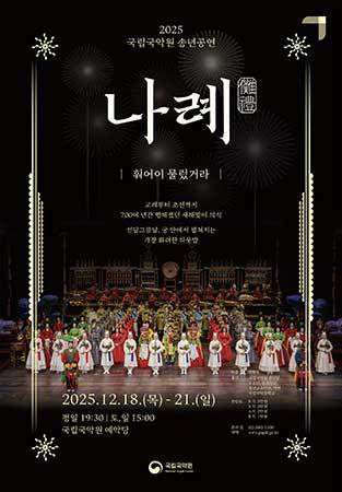 2025년 국립국악원 송년공연 ‘나례(儺禮)’가 화려하게 펼쳐졌다. 국립국악원 정악단, 민속악단, 무용단 등 130여 명의 단원이 출연하여 정악은 물론, 민속악과 평소에는 볼 수 없는 궁중무용까지 선보였다.