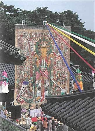 책의 뒷부분에는 괘불이 박물관 전시로 우리 곁에 오기까지 얼마나 많은 과정을 거치는지 상세히 설명하고 있다. 괘불은 말 그대로 야외에 거는 부처님 그림이다. 작게는 4~5m에서 크게는 14m까지, 아파트 7층 높이에 이르는 것도 있다.