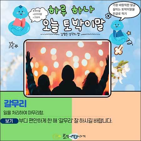 오늘의 토박이말 '갈무리'는 단순히 끝내는 것이 아니라, '일의 뒤처리를 잘하여 거두거나, 다음을 위해 잘 정돈하는 것'을 뜻합니다. 저는 지난 글에 있었던 낡은 버릇들을 깨끗이 갈무리하고, 새해에는 여러분의 가슴에 닿을 수 있는 새로운 글을 쓰는 사람으로 다시 태어나고자 합니다.