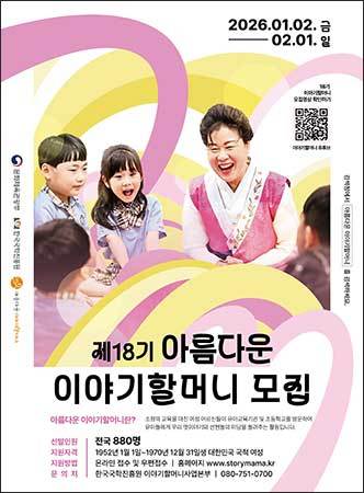 [우리문화신문=윤지영 기자] 한국국학진흥원(원장 정종섭)은 문화체육관광부(장관 최휘영, 아래 문체부)의 지원으로 2026년 1월 2일(금)부터 2월 1일(일)까지 유아교육기관을 방문해 유아들에게 옛이야기를 들려줄 제18기 아름다운 이야기할머니 880명을 공개 모집한다.