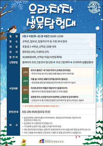 [우리문화신문=이나미 기자] 칠보생태환경체험교육관이 겨울방학 프로그램 ‘으라차차 생물탐험대(겨울 탐조프로젝트)’에 참여할 초등학교 1~4학년 어린이 15명을 선착순으로 모집한다.