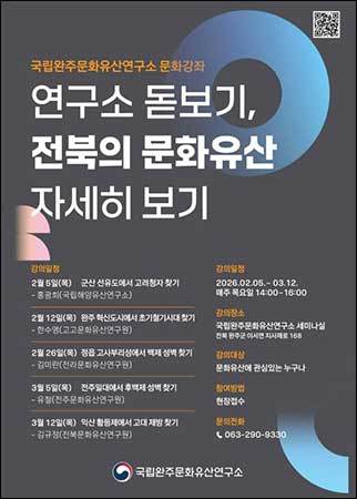 [우리문화신문=한성훈 기자] 국가유산청 국립문화유산연구원 국립완주문화유산연구소(소장 이규훈, 이하 ‘완주연구소’)는 2월 5일부터 3월 12일까지 매주 목요일 모두 5회에 걸쳐 완주연구소(전북 완주군)에서, 전북지역 문화유산의 위상과 중요성을 알리고 지역민과 소통하기 위한 문화강좌 「연구소 돋보기, 전북의 문화유산 자세히 보기」를 운영한다.