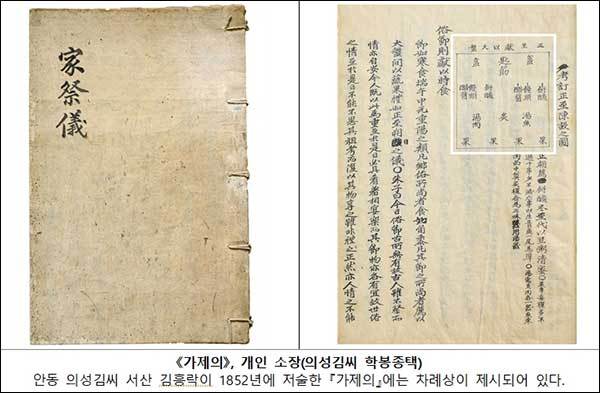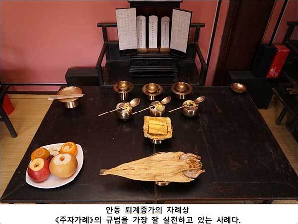 안동 의성김씨 서산 김흥락이 1852년에 쓴 《가제의(家祭儀)》의 차례상에는 술, 떡, 국수(만두), 육적, 탕 2종, 과일 4종이 그려져 있다. 《주자가례》보다는 많은 편이지만, 오늘날의 차례상과 비교하면 매우 간소하다. 이와 마찬가지로 안동 진성이씨 퇴계종가의 차례상은 술, 떡국, 명태전, 북어, 과일 한 접시로 구성되어 있다. 이들 모두 《주자가례》에 명시된 규범을 최대한 지키면서 한국적 정서를 적절히 반영시키고 있다.