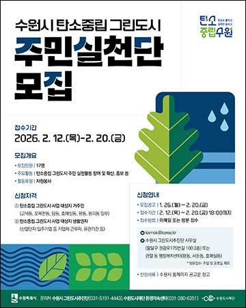 [우리문화신문=이한영 기자] 수원특례시(시장 이재준)가 ‘생활 속 탄소중립 실천’을 확산하기 위해 2월 12일부터 20일까지 탄소중립 그린도시 사업 대상지 주민ㆍ생활권자를 대상으로 ‘수원시 탄소중립 그린도시 주민실천단’ 신규 참여자를 모집한다. 주민실천단은 탄소중립 그린도시 사업 대상지 주민과 생활권자로 구성된 시민 참여 조직이다. 지역 내 탄소중립 실천 활동과 홍보, 주민 참여 활동 등을 한다.
