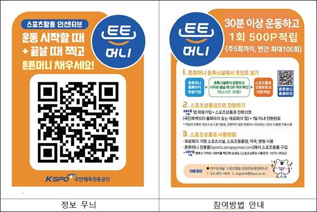 문체부와 체육공단은 응용프로그램(앱) 출시와 연계해 국민의 참여를 확대하기 위한 홍보와 다양한 행사도 추진한다. 체육공단은 ‘튼튼머니’ 참여자 가운데 마케팅 수신에 동의한 회원을 대상으로 행사 혜택 등을 알림톡으로 안내하고 있다. ‘튼튼머니’ 참여와 행사에 대한 더 자세한 내용은 ‘국민체력100’ 누리집(nfa.kspo.or.kr)에서 확인할 수 있다.