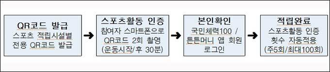 * 국민체력인증센터(75곳, 지정스포츠클럽과 민간체육시설(3,990곳) 등 응용프로그램 출시 뒤 지도에서 ‘내 주변 적립 가능 시설’ 검색 가능