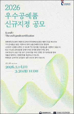 [우리문화신문=이한영 기자] 문화체육관광부(장관 최휘영, 아래 문체부)와 한국공예ㆍ디자인문화진흥원(아래 공진원)은 ‘2026년 우수공예품 신규 지정 공모’ 접수를 지난 3월 4일부터 시작하여 3월 30일까지 한다고 밝혔다.