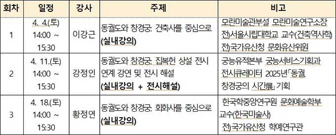 또한 프로그램 운영 기간에는 중 모두 3회(4.4, 4.11, 4.18.)에 걸쳐 건축사·미술사 분야 전문가 초청 특별 강연도 함께 진행되어 동궐도와 창경궁의 역사적 의미를 보다 깊이 이해할 수 있다.