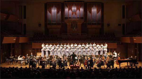 출연진과 연주진 : 말, 노래, 합창, 관현악, 타악이 맞물리는 무대