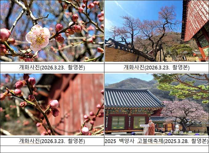 윤태용 행정과장은 “백양사 고불매 개화를 맞아 많은 탐방객이 봄의 정취와 탐매(探梅)의 즐거움을 만끽하시길 바란다.”라고 말했다. 한편, 2026 백양사 고불매 선매향 축제는 3월 28일(토) 10:00~17:00 백양사 일원에서 선명상, 향기명상, 걷기명상 등 명상 프로그램과 갤러리, 먹거리 마켓 등 다양한 행사가 진행될 예정이다.